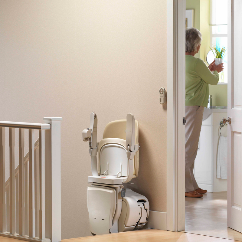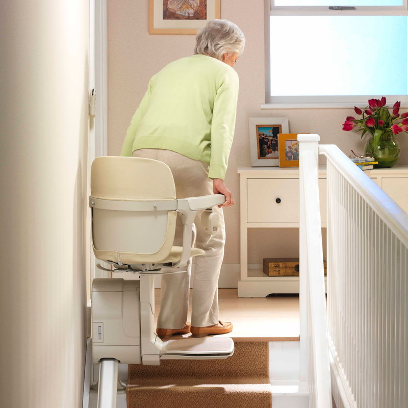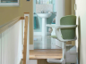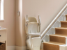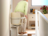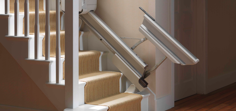 The straight Stannah chairs can be easily folded up when not in use. The footplate is linked to the seat cushion.